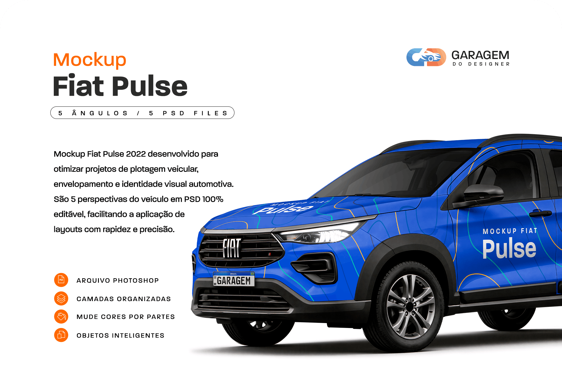 Este mockup é ideal para apresentações comerciais, propostas para clientes, portfólio profissional e materiais de divulgação, oferecendo uma visualização clara e profissional do projeto final. Por ser desenvolvido especificamente para o Mockup Fiat Pulse, ele não é compatível com outros modelos.