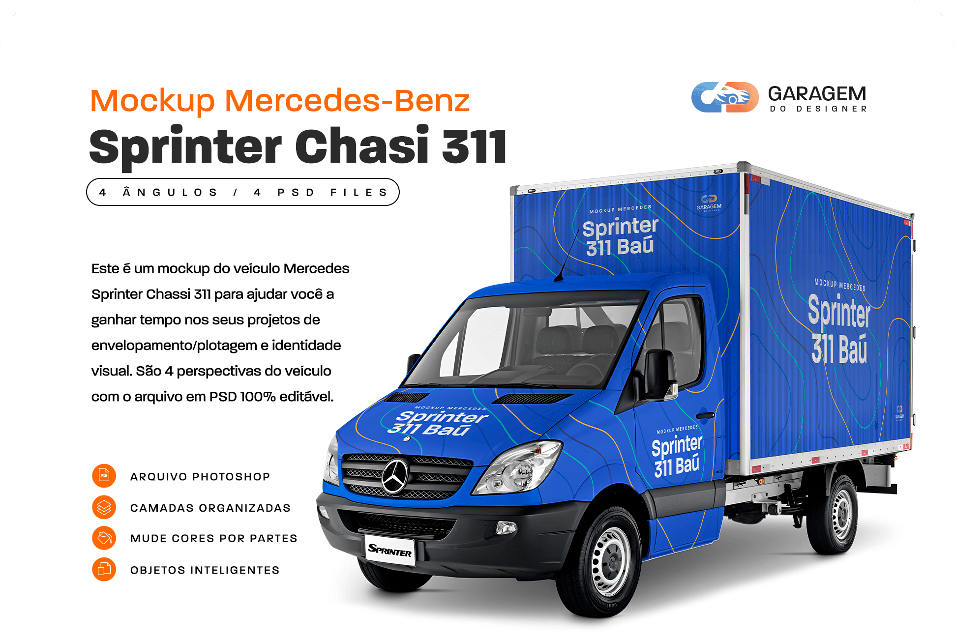 Mostre seu projeto de forma profissional e impressione seus clientes com o Mockup Sprinter Chassi 311. Este mockup ajuda você a economizar tempo em trabalhos de envelopamento, plotagem e identidade visual, proporcionando qualidade e precisão para seus designs. Confira as informações e vantagens do mockup: