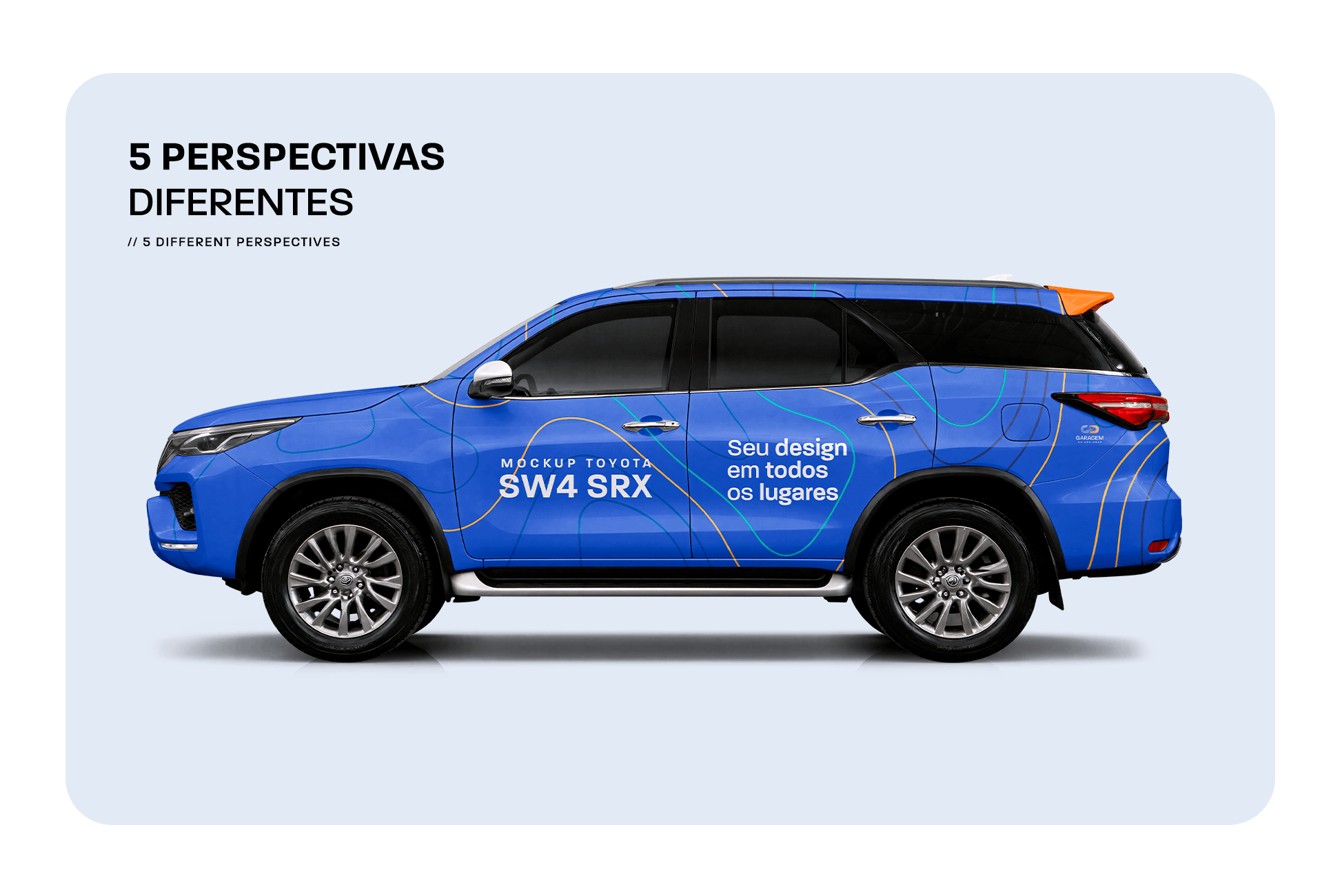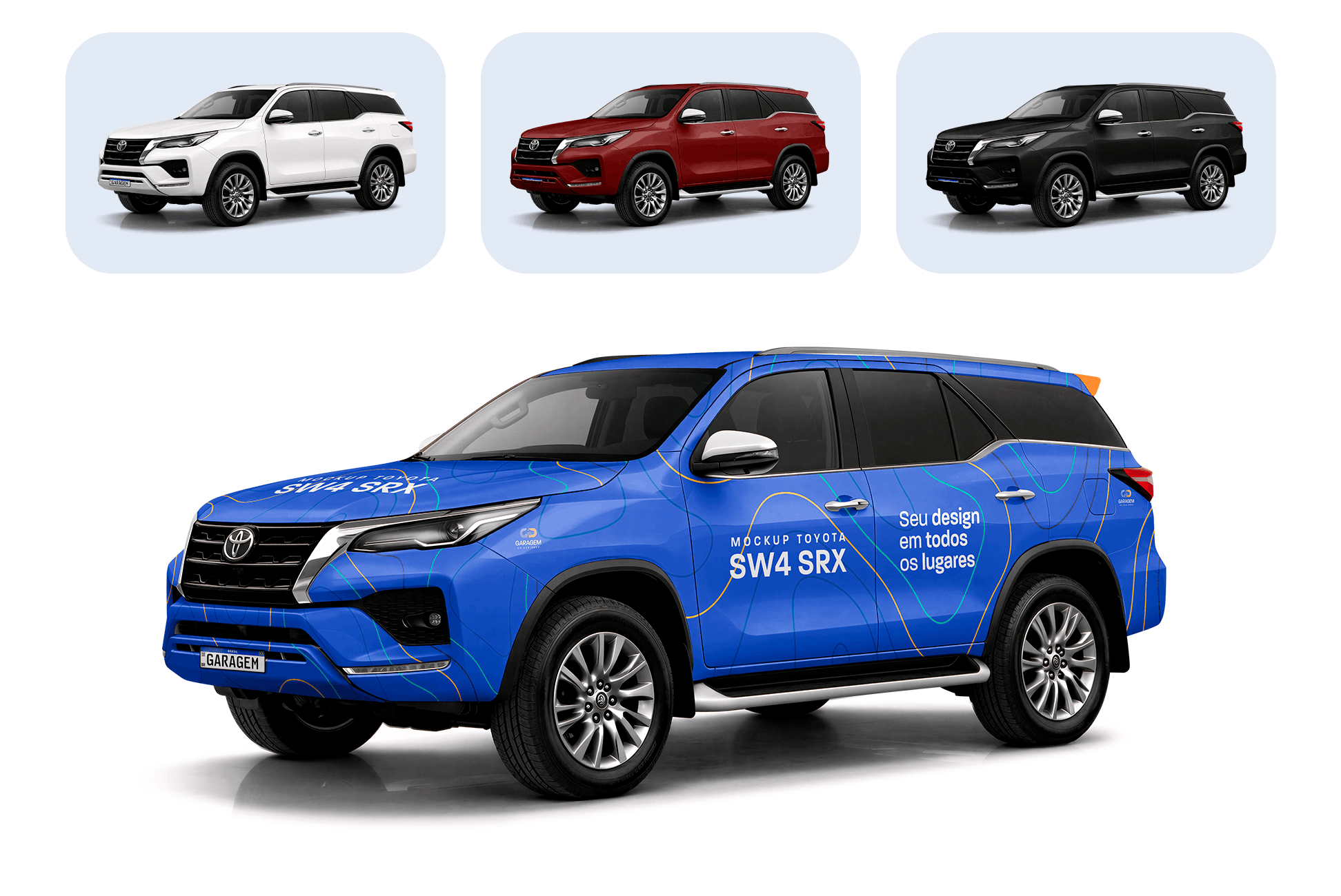 Mostre seu projeto de forma profissional e impressione seus clientes com o Mockup Toyota SW4 (Fortuner). Este mockup ajuda você a economizar tempo em trabalhos de envelopamento, plotagem e identidade visual, proporcionando qualidade e precisão para seus designs. Confira as informações e vantagens do mockup: